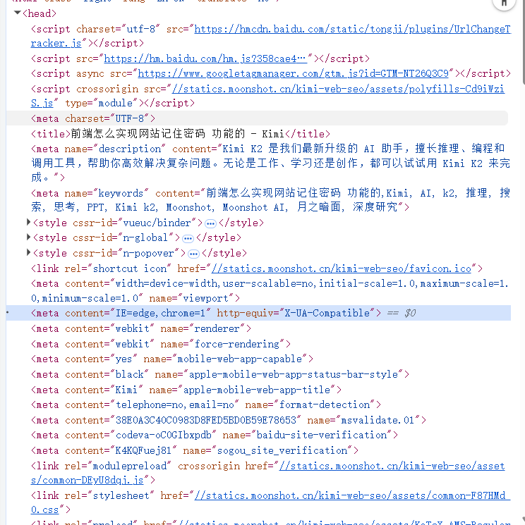 <meta http-equiv="X-UA-Compatible" content="IE=edge">这个标签告诉浏览器使用最新的渲染引擎,避免在旧版 Internet Explorer 中出现兼容性问题。<meta name="robots" content="noindex, nofollow">通过这个标签,开发者可以控制搜索引擎是否索引该页面及跟踪页面中的链接。