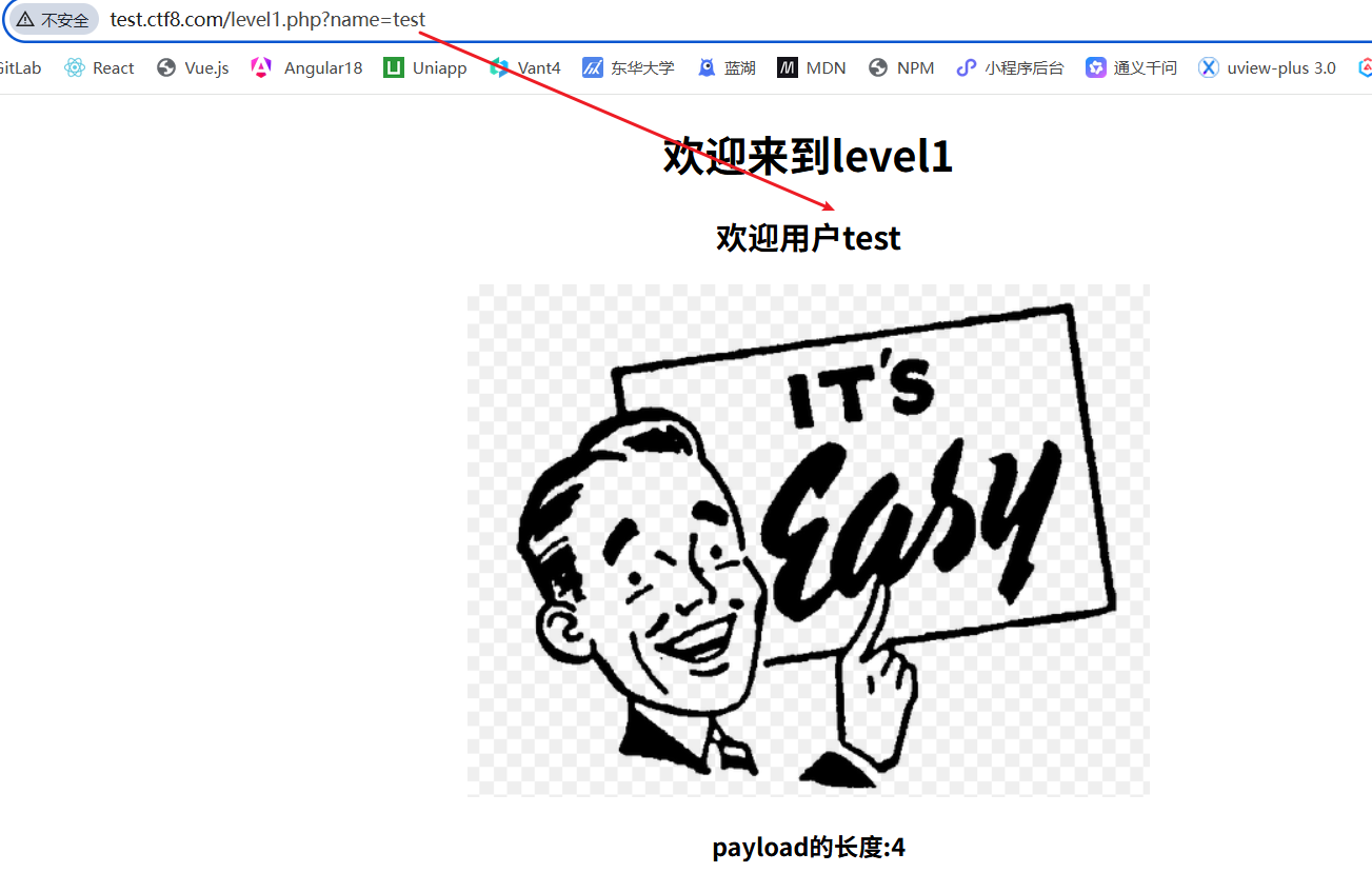 1,浏览器输入 :http://test.ctf8.com/level1.php?name=test, test 字符串会显示到网页上面,如下图:
