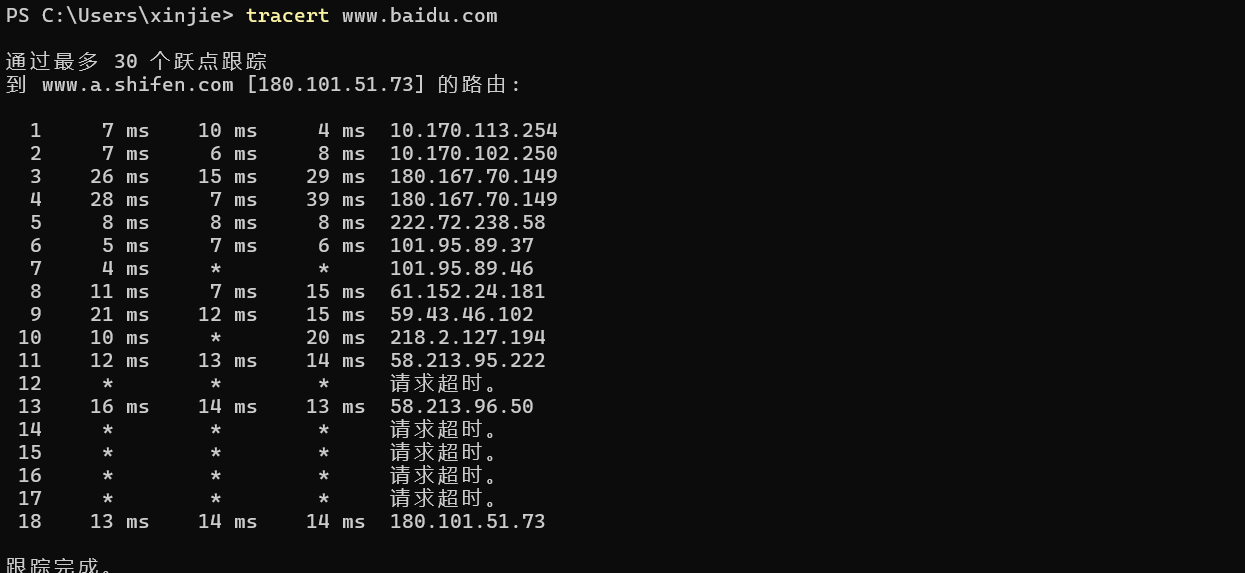 -n:不解析 IP 为域名(加快显示)-m 跳数:设置最大跳数-w 超时:设置等待超时(秒)