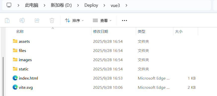 将 Vue3 打包目录拷贝到 Nginx 的部署目录,我这里是 D:\Deploy\vue3