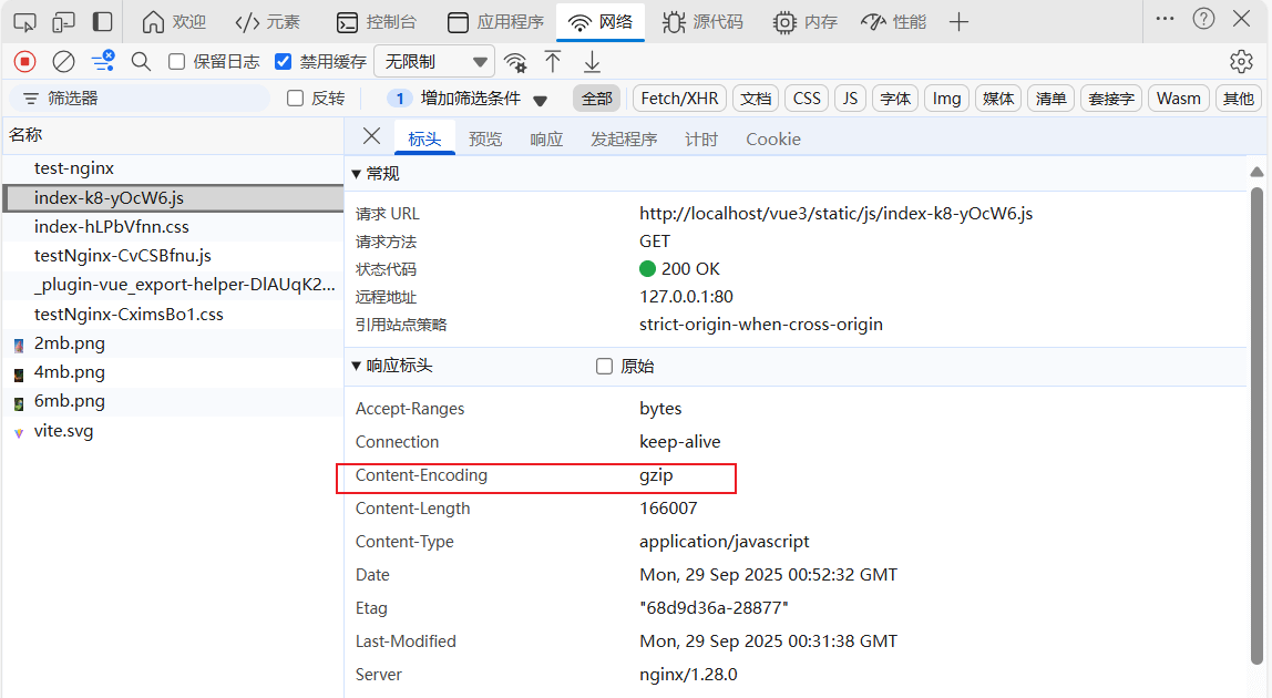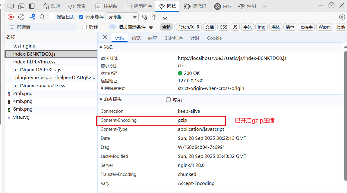 启动 Nginx 后,访问 http://localhost/vue3/,查看 Network 面板,查看 JS/CSS 文件响应头的字段 content-encoding 为 gzip,说明开启了 Gzip 压缩。