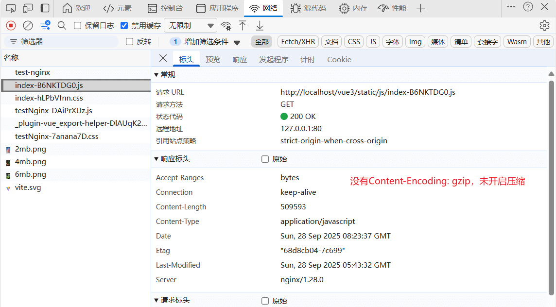 如果没有 content-encoding 字段,说明未成功开启gzip。