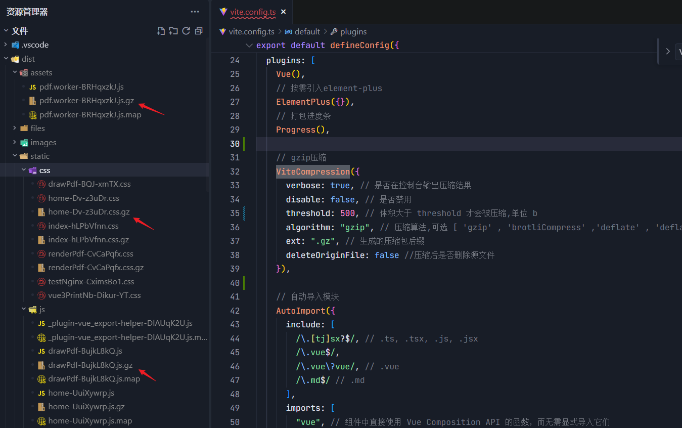 客户端开启 Gzip 压缩,需要在使用第三方插件在打包构建时就需要生成对应的 .gz 文件。我的 vue3 项目使用的是 vite-plugin-compression,在 vite.config.ts 中这样配置: