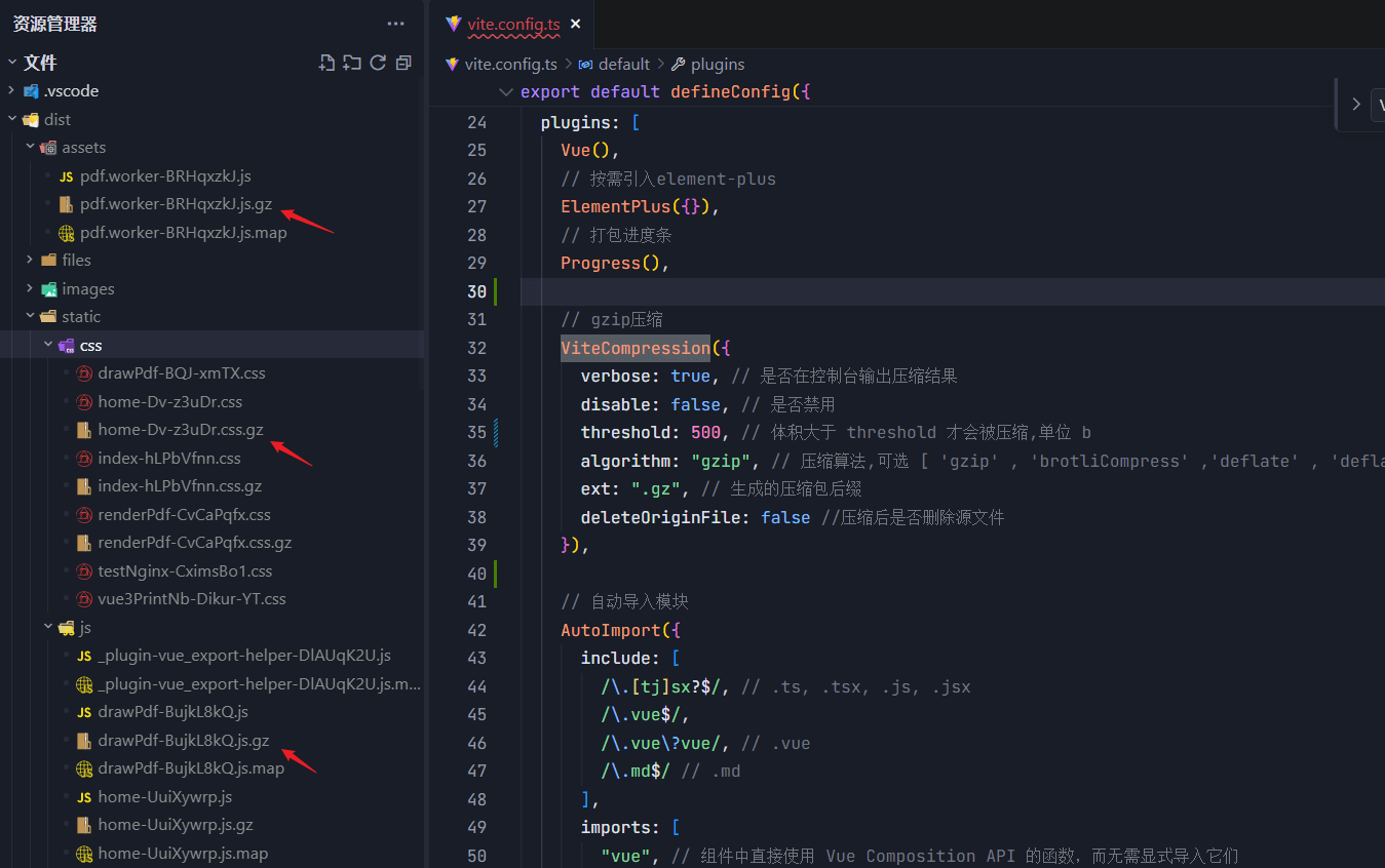 });运行 vite build 打包项目,会在 dist 目录下生成对应的 .gz 文件。
