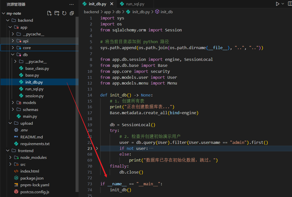 这个文件在当前的项目结构中确实属于独立工具脚本,使用了if __name__ == "__main__": 保护。这意味着里面的核心逻辑(如 init_db()只有在你手动运行该文件时(例如python app/db/init_db.py)才会执行。