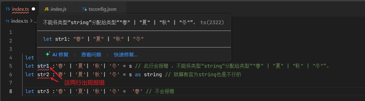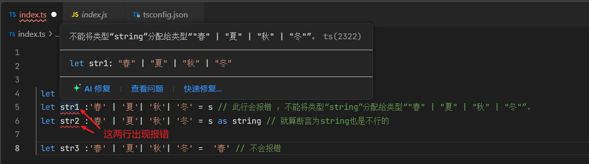 let str2: "春" | "夏" | "秋" | "冬" = s as string; // 仍然报错